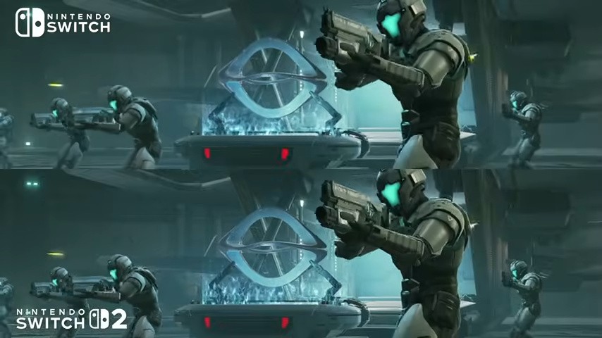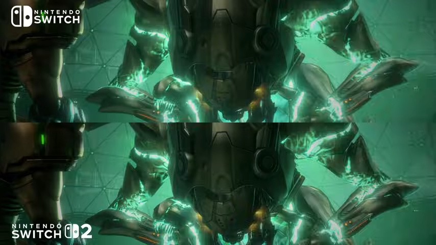 Even though image quality takes a hit — pixel count is around "504p for geometry, 576p for Samus' visor", which is lower than 2023's Metroid Prime Remastered on Switch — there's a lot more going on here. While the pixels might be lower, the level-of-detail in the environment, shadows, and particular effects are "seemingly identical" to the Switch 2 version.
