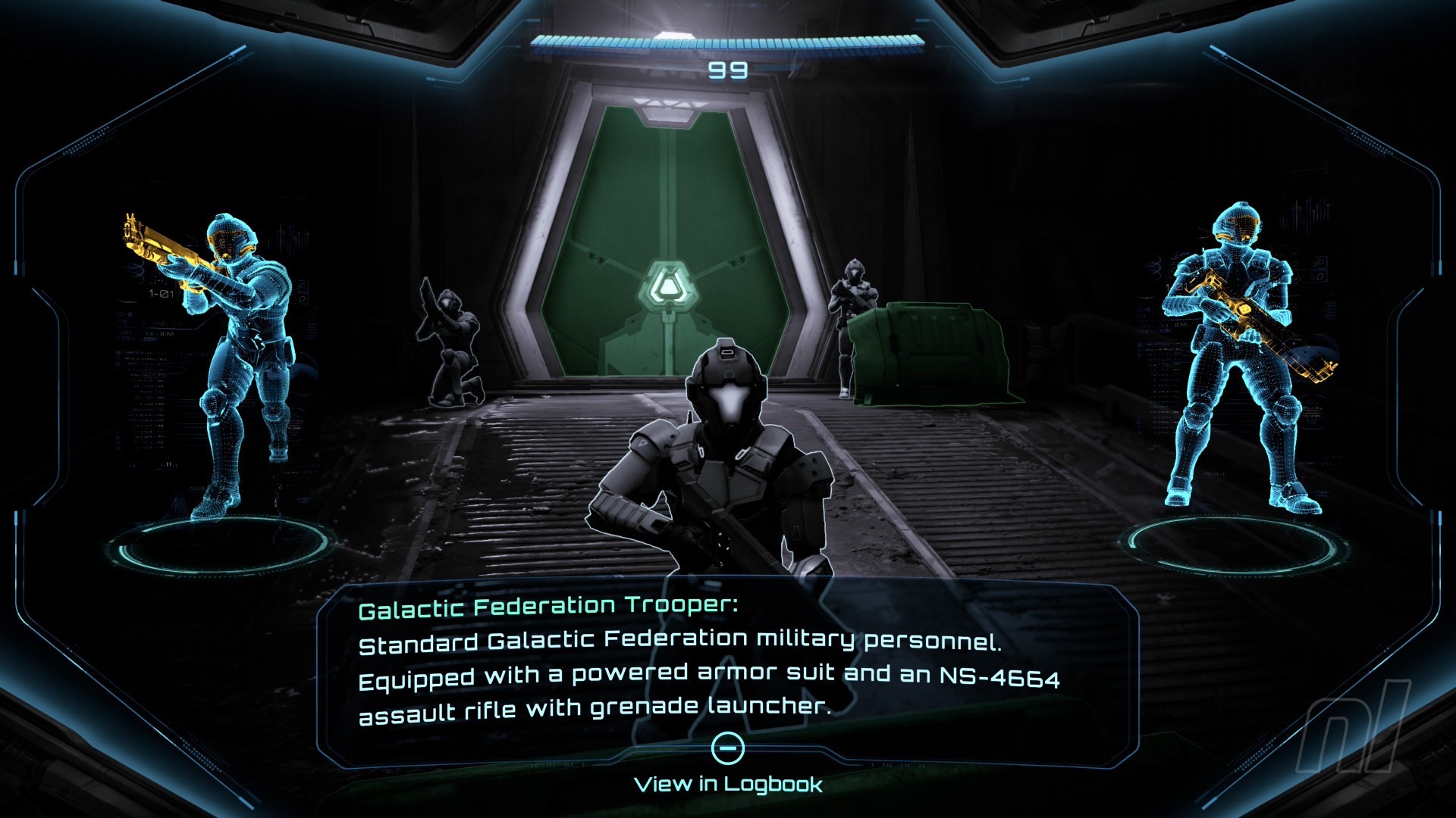 Once you’ve cleared the area of enemies, you’ll spot a couple of Galactic Federation Troopers at the end of the path by a door. Scan one of them to add it to your logbook.