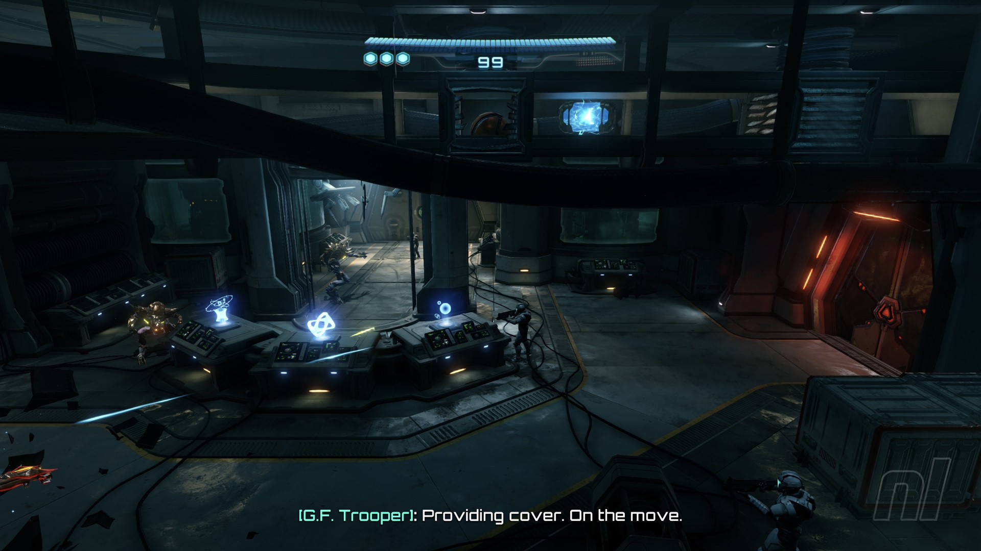 Upon touching down on the Landing Pad (and saying goodbye to your beloved ship), head forward and dispatch any injured Space Pirates along the way.