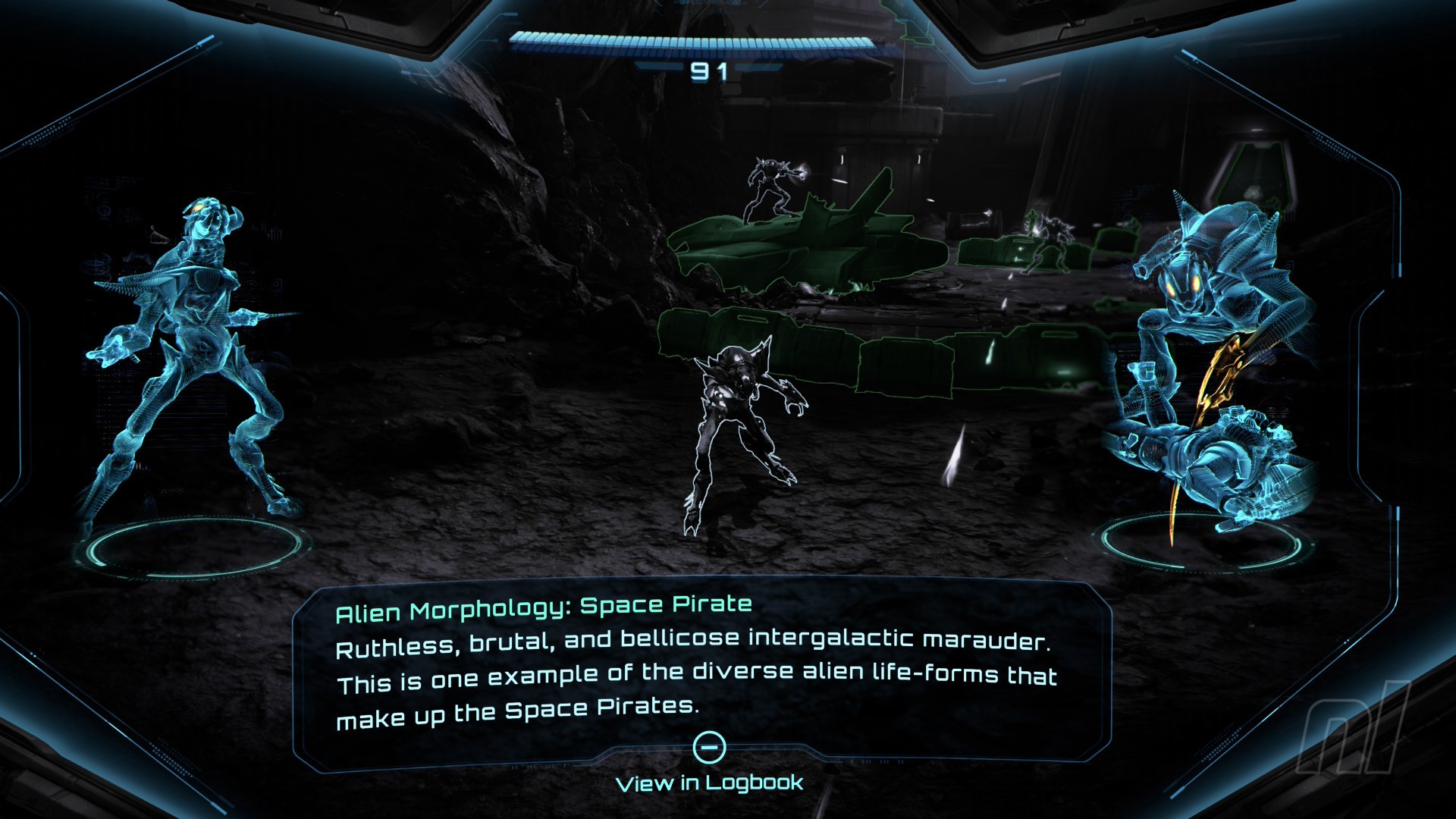 Amongst the injured enemies is a full-fledged, healthy Space Pirate. You’ll be tempted to shoot it too, but hold fire for a moment, as this is your first logbook entry of the game. Scan it.